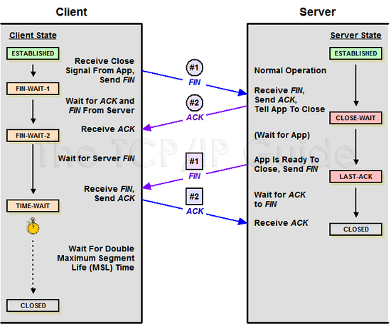 클라이언크가 연결을 종료하겠다는 FIN 플래그를 전송한다. 서버에서 확인했다는 것을 알기위해 ACK 플래그를 전송한다. 서버의 통신이 끝났으면 연결을 종료한다는 의미에서 클라이언로 FIN 플래그를 보낸다. 클라이언트는 확인했다는 의미로 ACK 플래그를 전달한다.