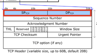 통신 레이어(trasport layer)에는 TCP 헤더가 들어간다. 여기서 중요한 것은 SP(출발지 포트번호)와 DP(목적지 포트번호)이다. 출발지 포트는 내 컴퓨터에서 만든 소켓 포트 번호이라 알아서 처리해준다. 목적지 포트번호는 url 뒤에 명시적으로 언급되어 있지 않다면 기본적으로 80번 포트로 향한다.